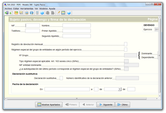 El primer paso consiste en crear una nueva declaración del Modelo 390. Algunos campos se rellenan a mano y otros automáticamente. Para pasar página basta con hacer clic en los botones de la barra inferior.